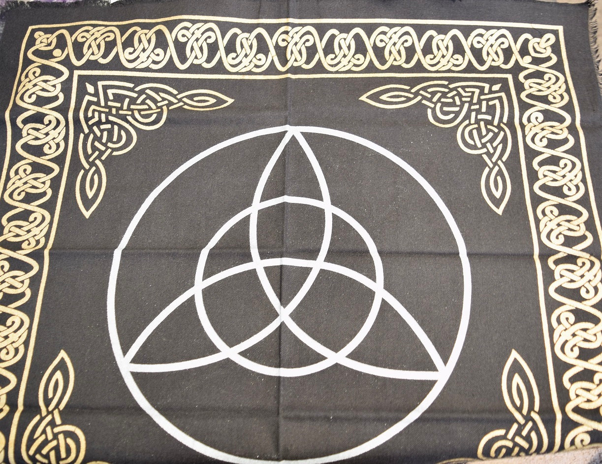 This square altar cloth features a large Triquetra symbol, which is known to represent the "holy three" throughout history: the Triple Goddess (maiden, mother, crone), the Holy Trinity, etc. It also has beautiful, golden Celtic Knot designs in the corners and around the border. There is fringe around borders, as well.