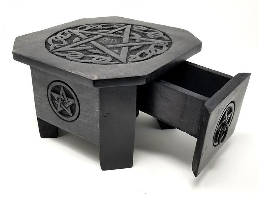 Features a large, beautiful, intricately-carved pentagram on the top and then smaller pentagrams on the sides. The table measures 7.5 inches wide by 7.5 inches long and stands 5 inches tall.