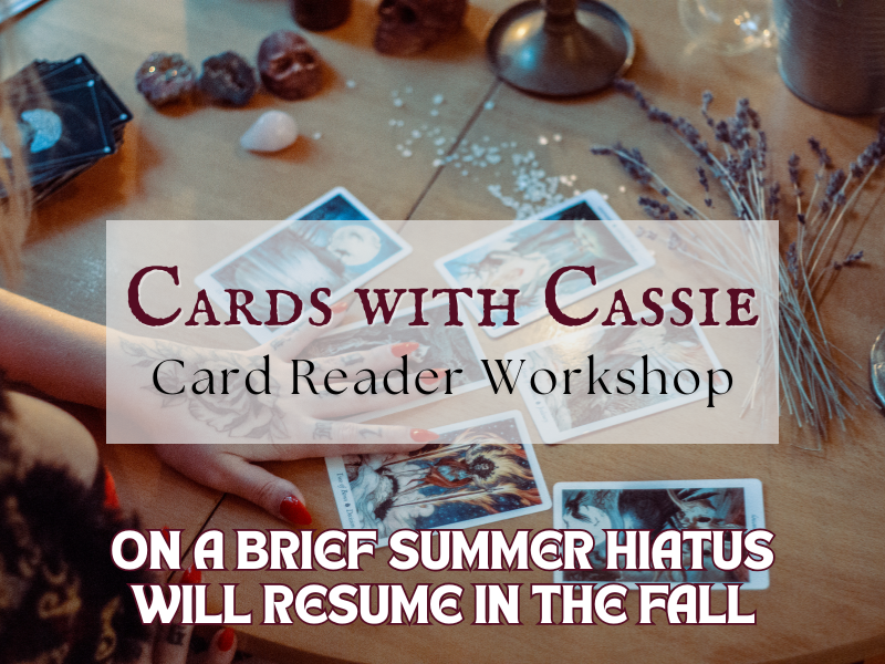 Join Cassie as she leads you through a quick lesson on cartomancy - the process of divining with Tarot, Oracle, or other similar card decks. Then, students will work together to carry out their own readings for each other in a safe, beginner-friendly space. No experience required. Please bring your own deck (decks are for sale at the shop, if you need one).