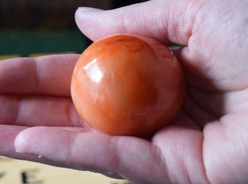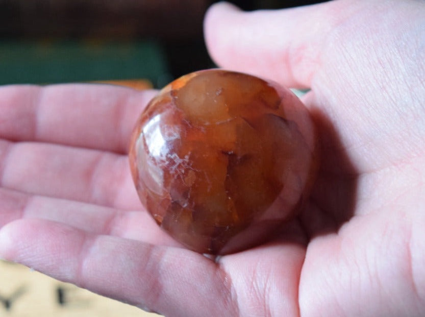 These palm stones are a great size, and they fit so comfortably in your palm since they're nice and round (almost like a sphere!). Some even have cloudy, translucent areas that show off the beauty of this orange type of Agate. We will intuitively choose the palm stone for you.