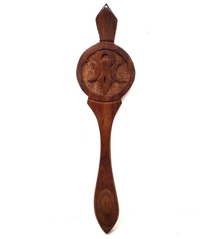 We love these wooden spoons because they feature a nicely carved Goddess design on top, and they are perfect for just scooping items into or around a burn bowl/cauldron. Place a bit of incense of herbs onto lit charcoal safely with the spoon or perhaps scoop some sand on top of the charcoal to extinguish it.