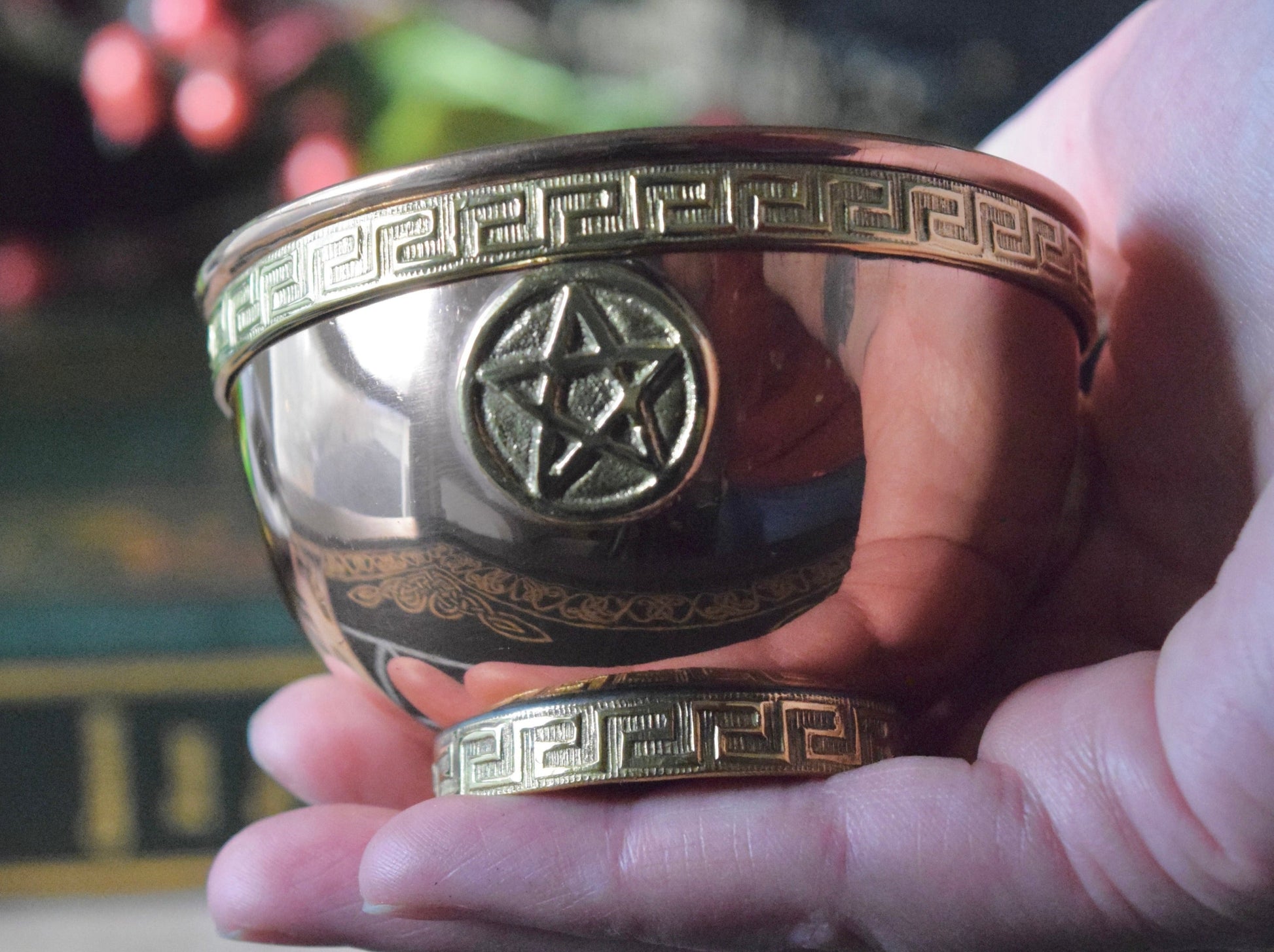 Perfect little copper bowl for burning your incense, herbs, resin, paper, and more. Features a pentagram symbol on one side and measures 3 inches in diameter.
