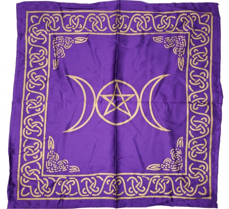 This square altar cloth is a stunning royal purple color. It has a triple moon/pentagram symbol in the middle and features a beautiful Celtic weave border, all in gold print. It measures 21 by 21 inches and can be placed on your altar or used as a wall decoration. Made of satin.