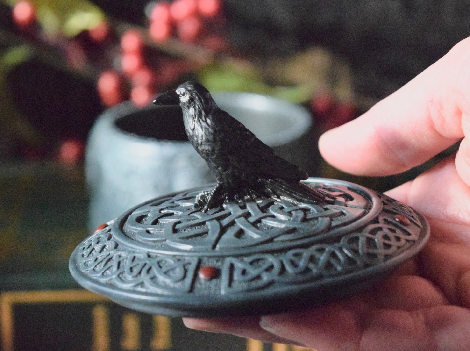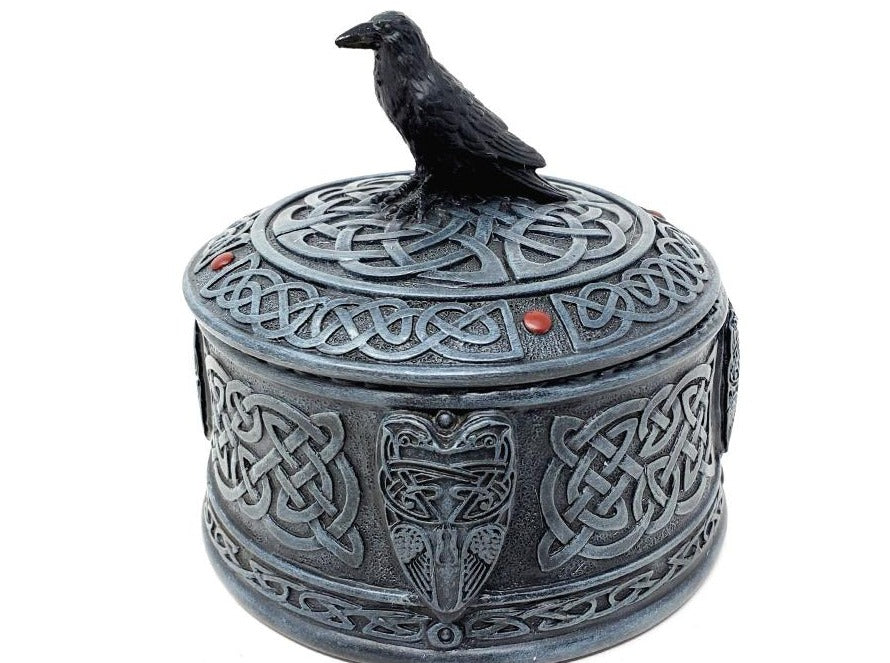 Followers of the Morrigan will appreciate this trinket box, adorned with Celtic designs and a little raven perched right on top. What we love about this small little box is the inside is also decorated! The box is made of cast poly resin and measures 4 x 4 x 3 5/8".