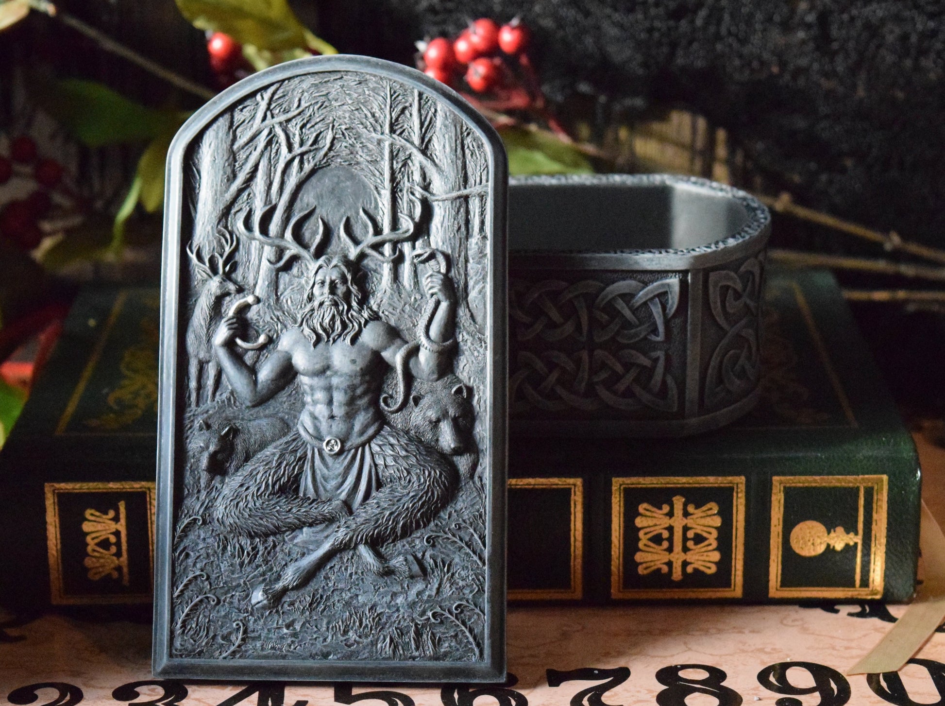 This stunning box honors Cernunnos, often called the Horned God (see more info below). The box features beautiful Celtic knot designs all around the outside and the inside. Made of cast poly resin and measures 6 1/8 x 3 3/8 x 2 3/8".