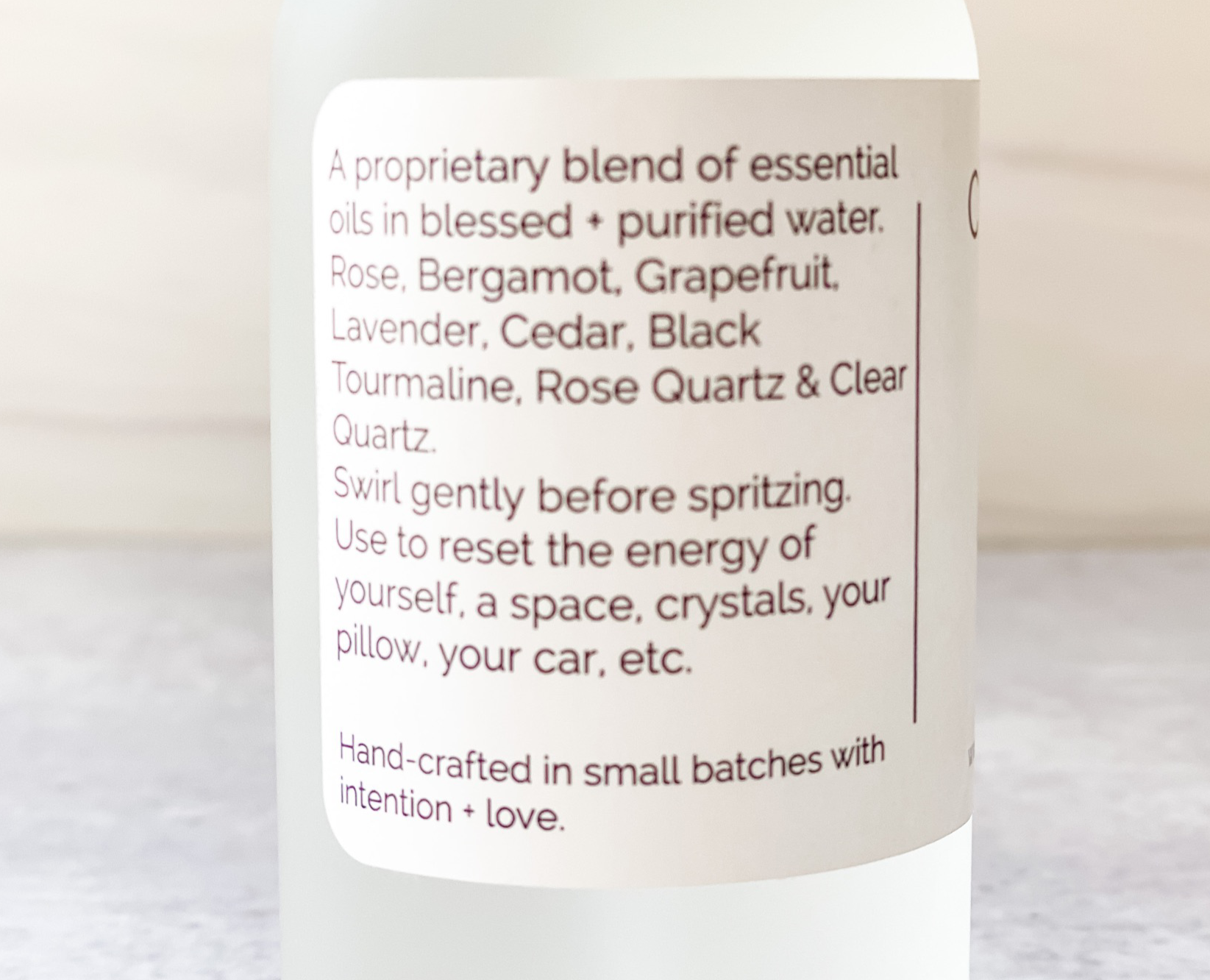As with all of my products, the proprietary formula has been gifted to me by Spirit. I combine organic essential oils with blessed water into a blend that not only smells divine but works like magic to clear what needs clearing!