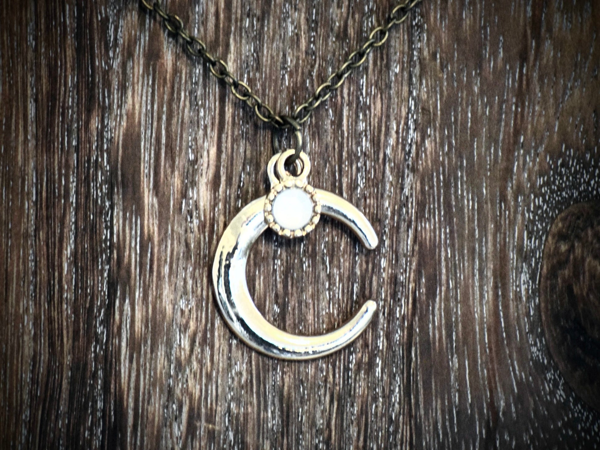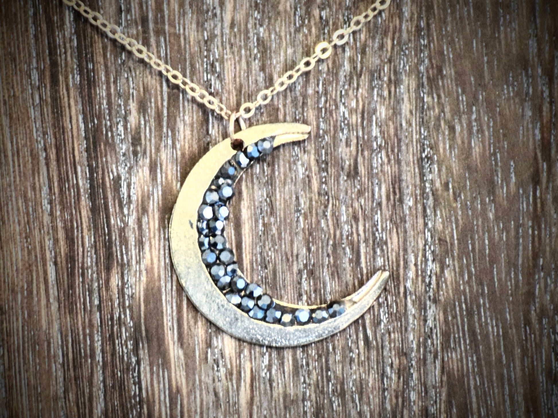 These simple crescent moon necklaces are both charming and elegant. One design features an Opalite bead on top of it, while the second design has some sparkly black and silver plastic crystals along one side.