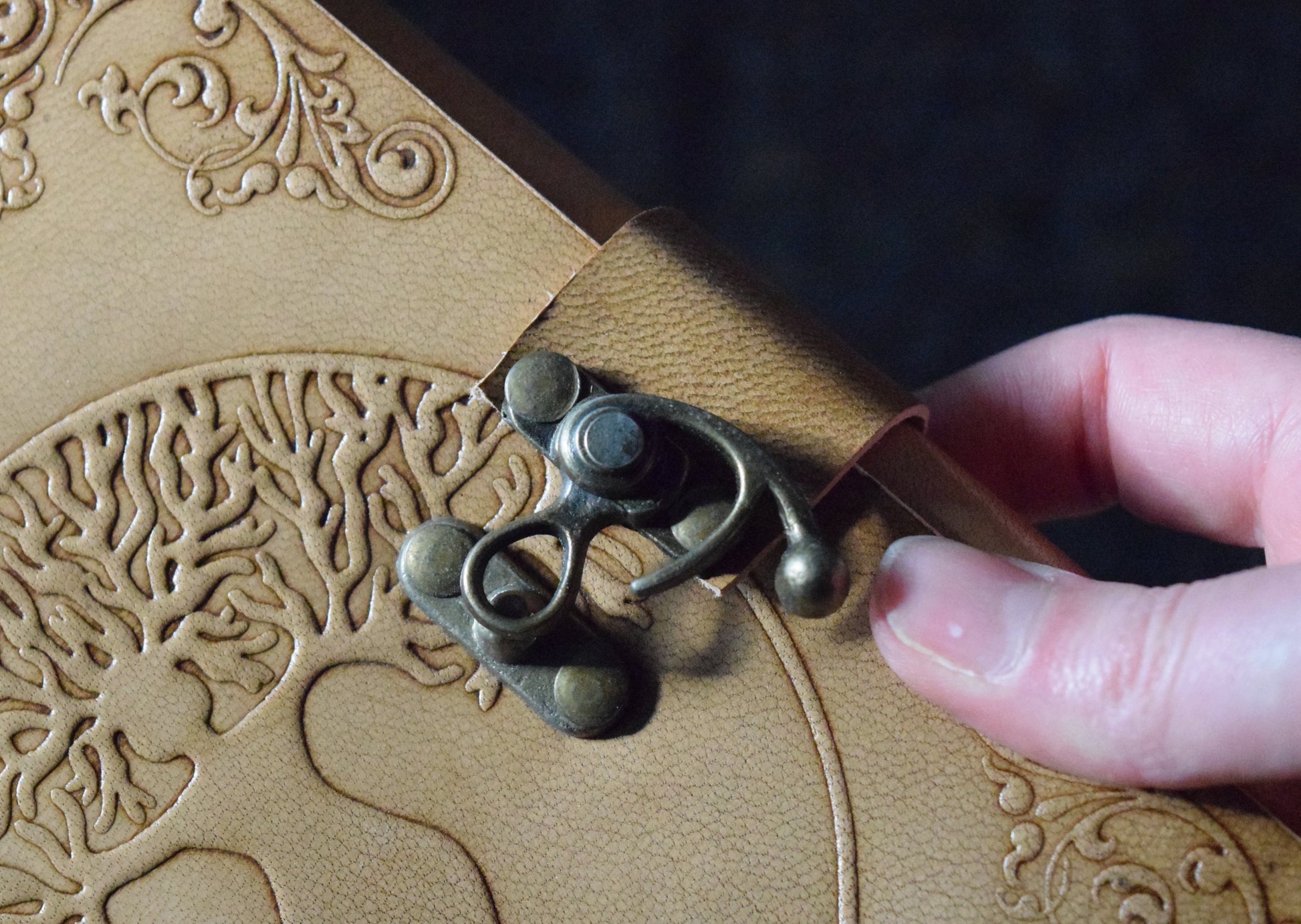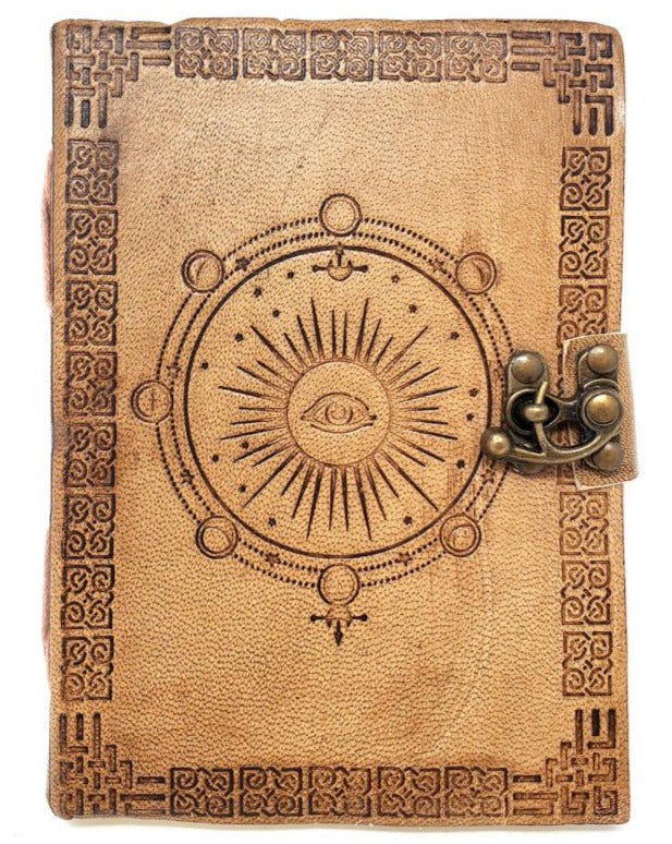 This leather journal features an embossed eye and moon phases on the front, representing the ups and down and comings and goings of our own life.