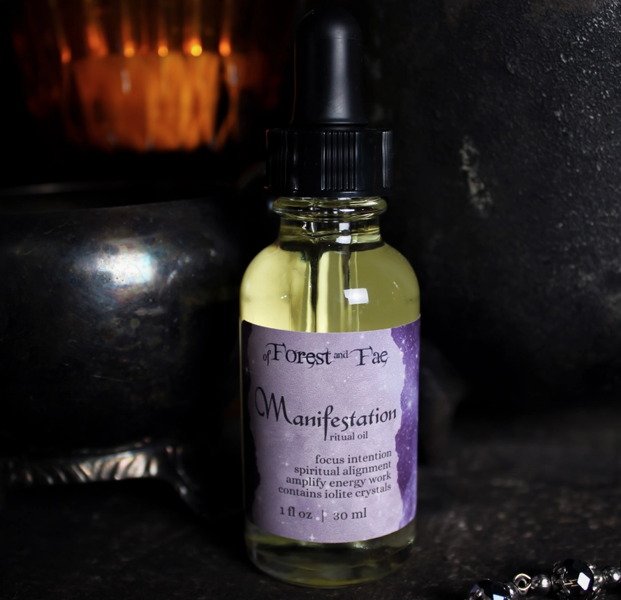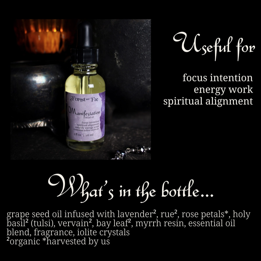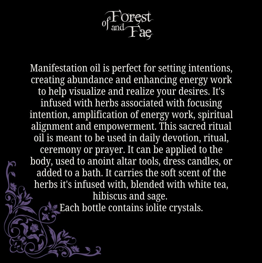 Manifestation oil is perfect for setting intentions, creating abundance and enhancing energy work to help visualize and realize your desires. It's infused with herbs associated with focusing intention, amplification of energy work, spiritual alignment and empowerment.