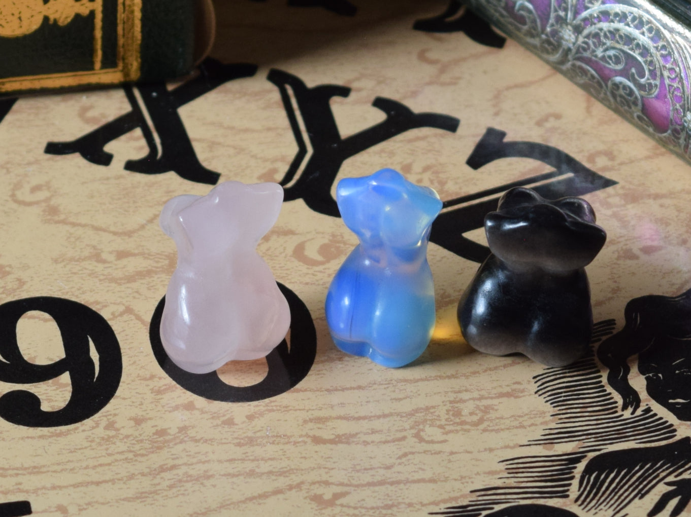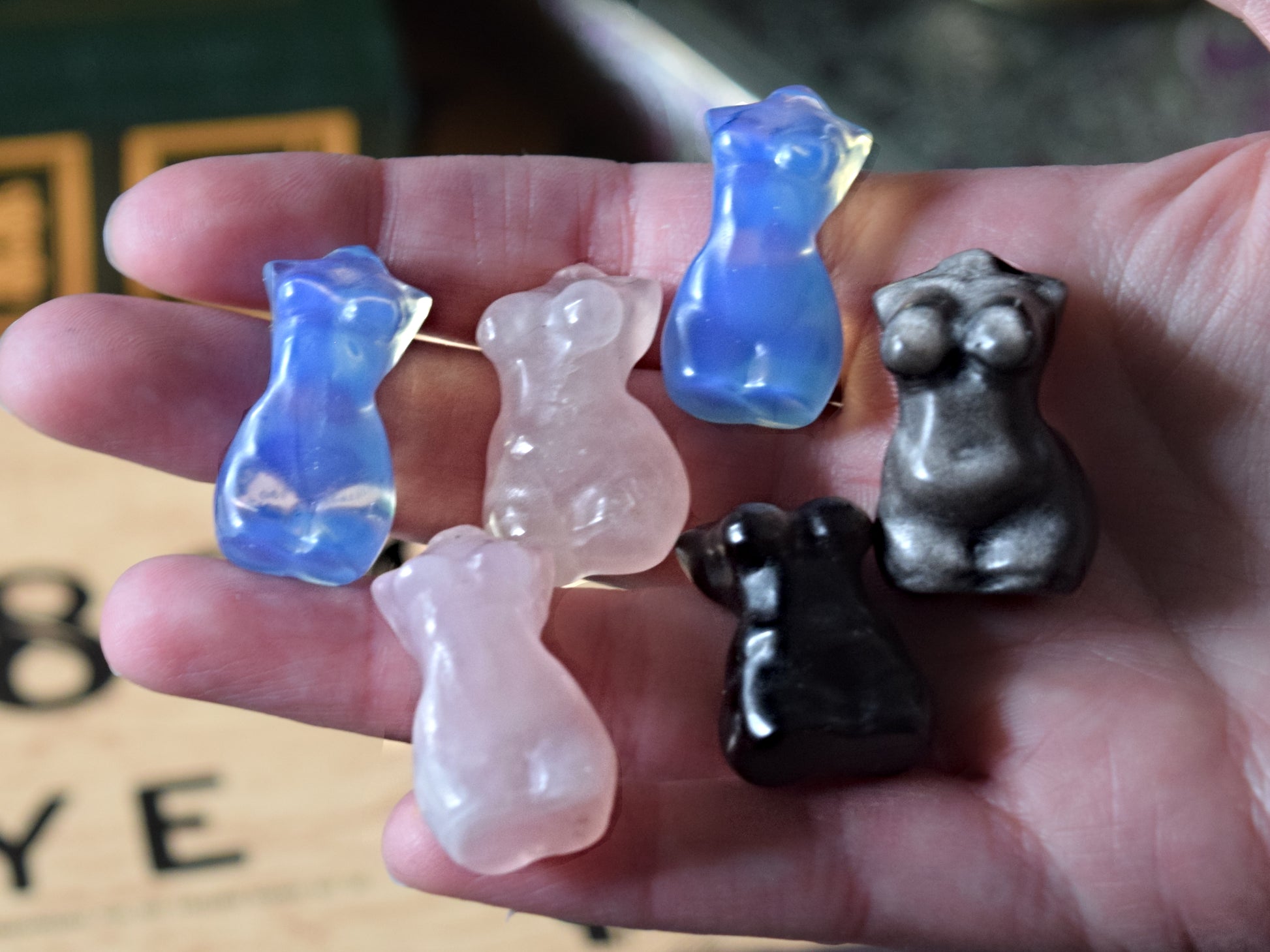 We currently have a selection of thre varieties of stones for these mini goddess figures: Opalite, Rose Quartz, and Sheen Obsidian. Metaphysical Properties of each follows: