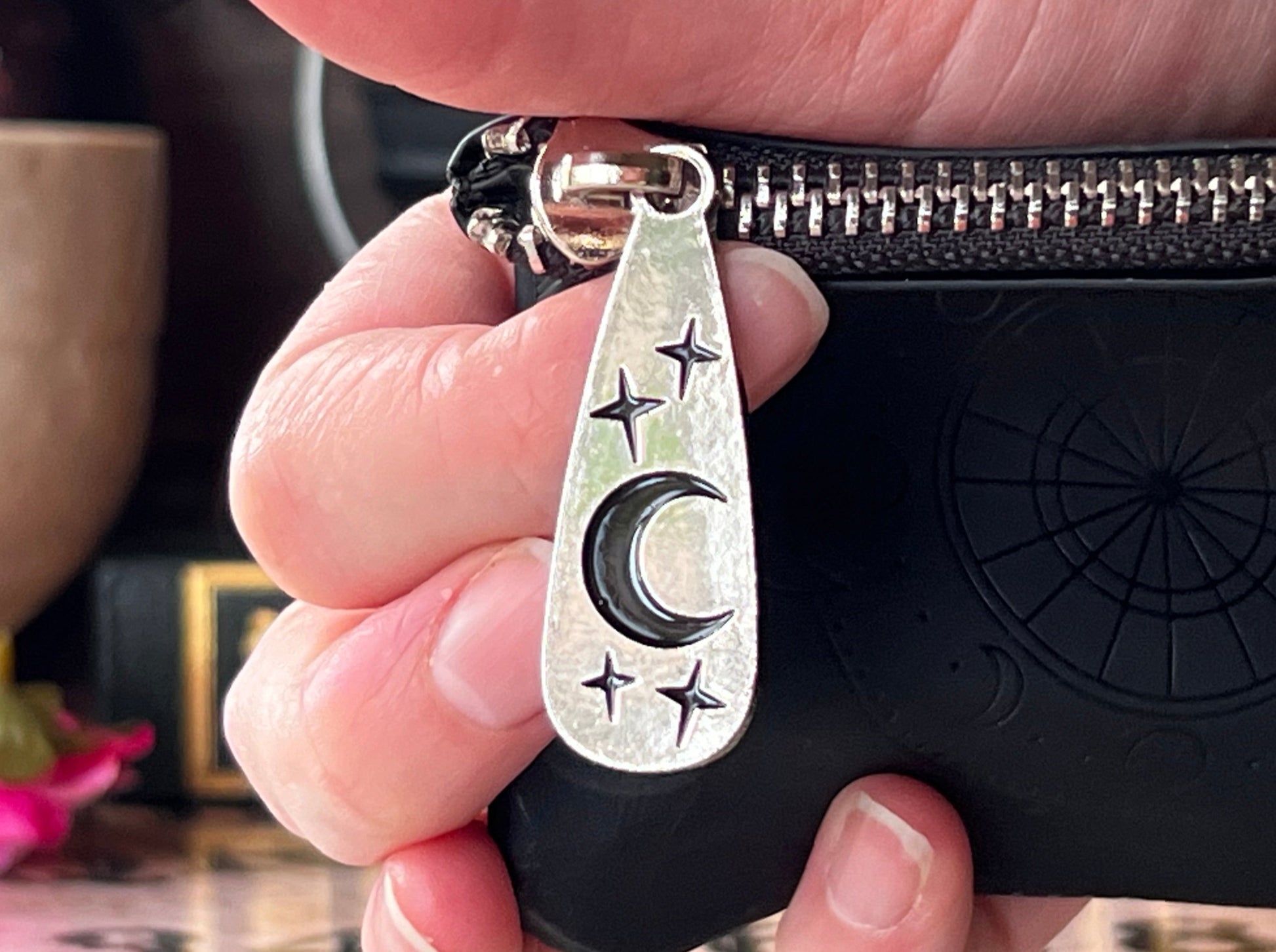- Silver tone zipper pull with moon and stars design