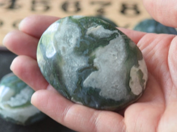 These palm stones are excellent specimens of Moss Agate with green and white mossy patterning and small druzy quartz pockets and caves. Palm stones are ideal for carrying around in your pocket or holding in the palm of your hand as a worry stone to help stabilize your energy and bring some grounding energy into your life. We will intuitively choose the piece for you.