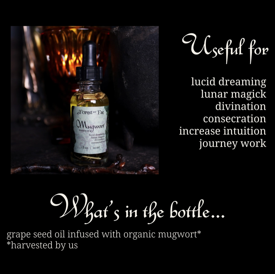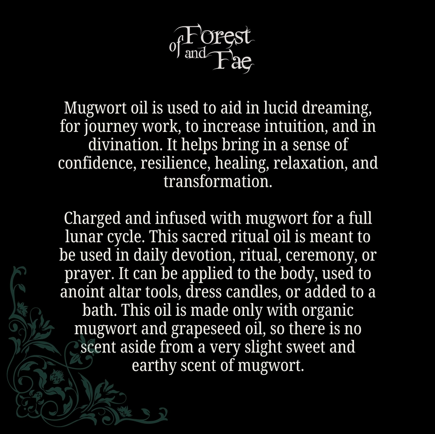This oil is made only with organic mugwort and grapeseed oil, so there is no scent aside from a very slight sweet and earthy scent of mugwort. *Many of the herbs Of Forest and Fae use in their handmade potions and offerings are hand-harvested and respectfully gathered from the land by them, through ethical & sustainable wildcrafting, or are grown on their own property.