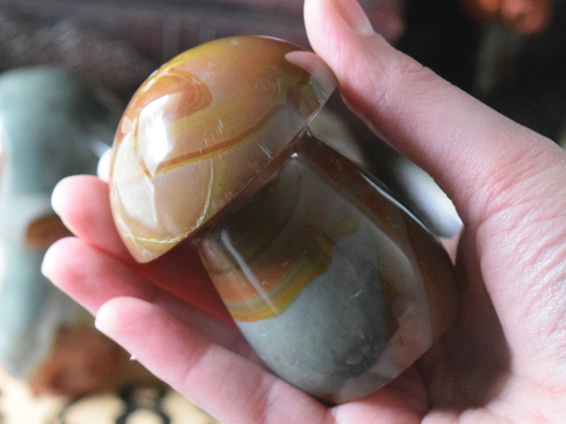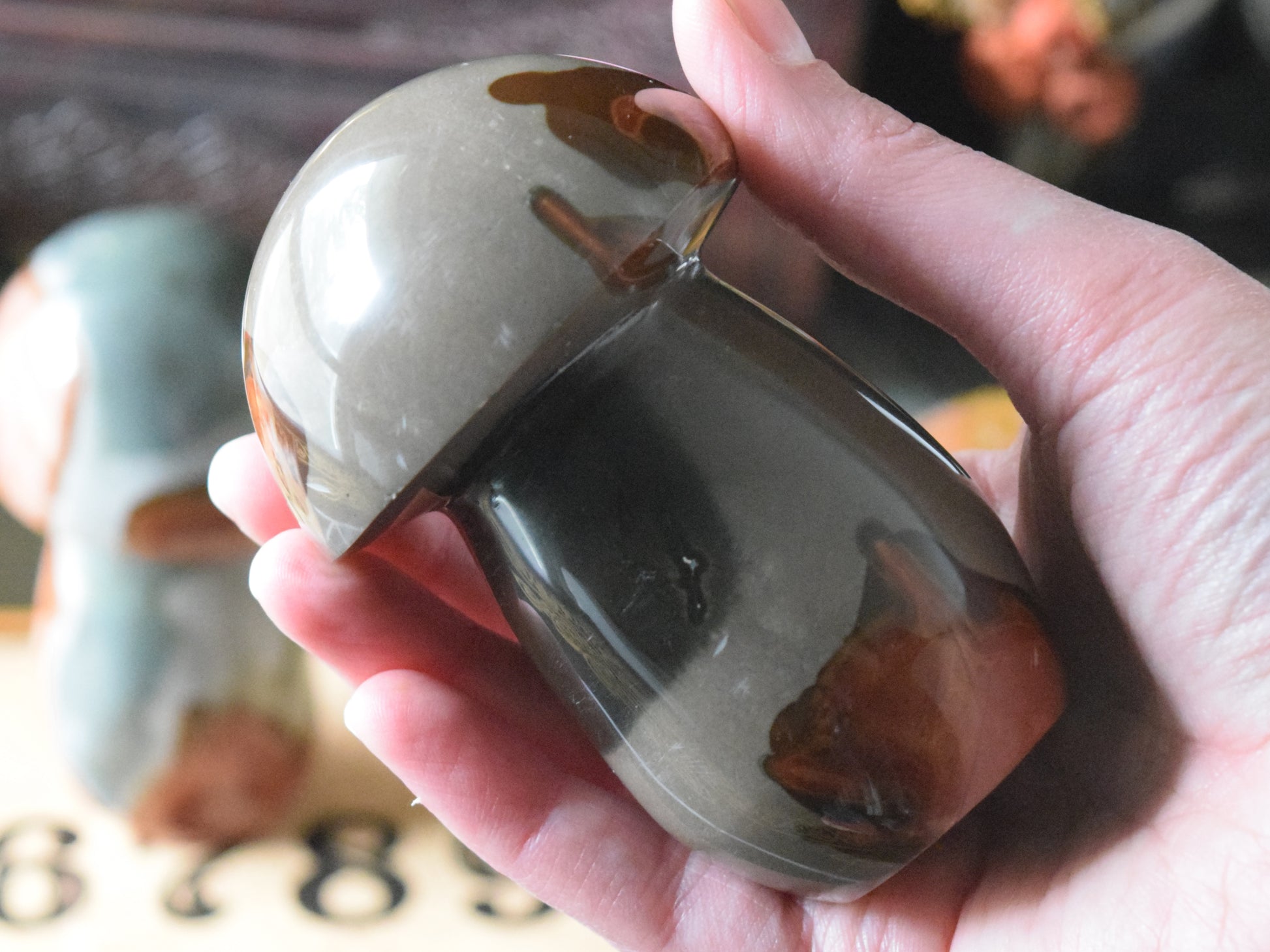 These mushroom shaped carvings truly show off the unique colors and patterns of Polychrome Jasper! They stand solidly on flat surfaces and make an excellent decoration for your altar or a perfect gift for mushroom lovers. We will intuitively select one for each order.