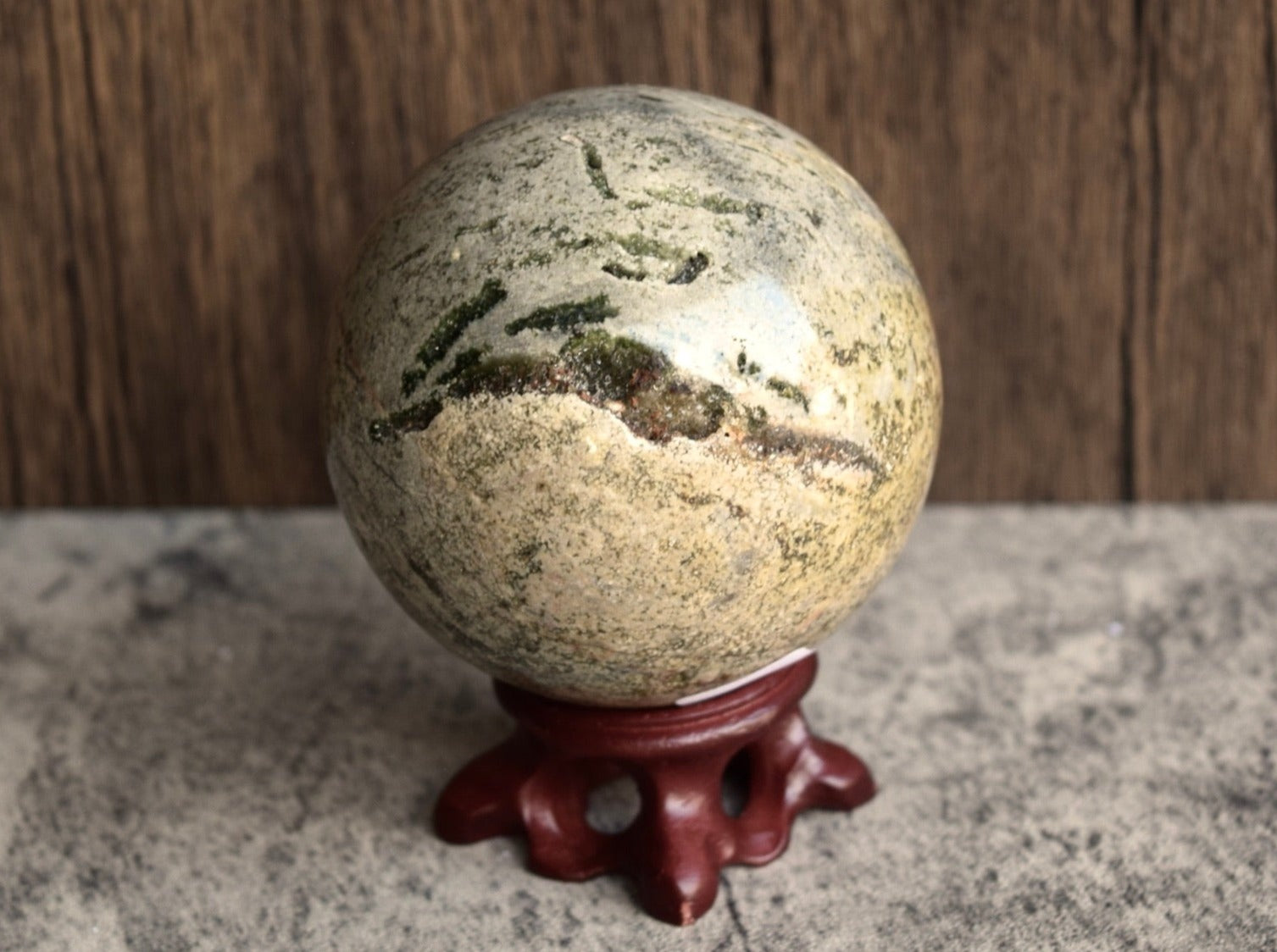 This lighter green sphere has a really cool pocket on one side, showing off spectacular druzy quartz crystals inside! Comes with its own stand.