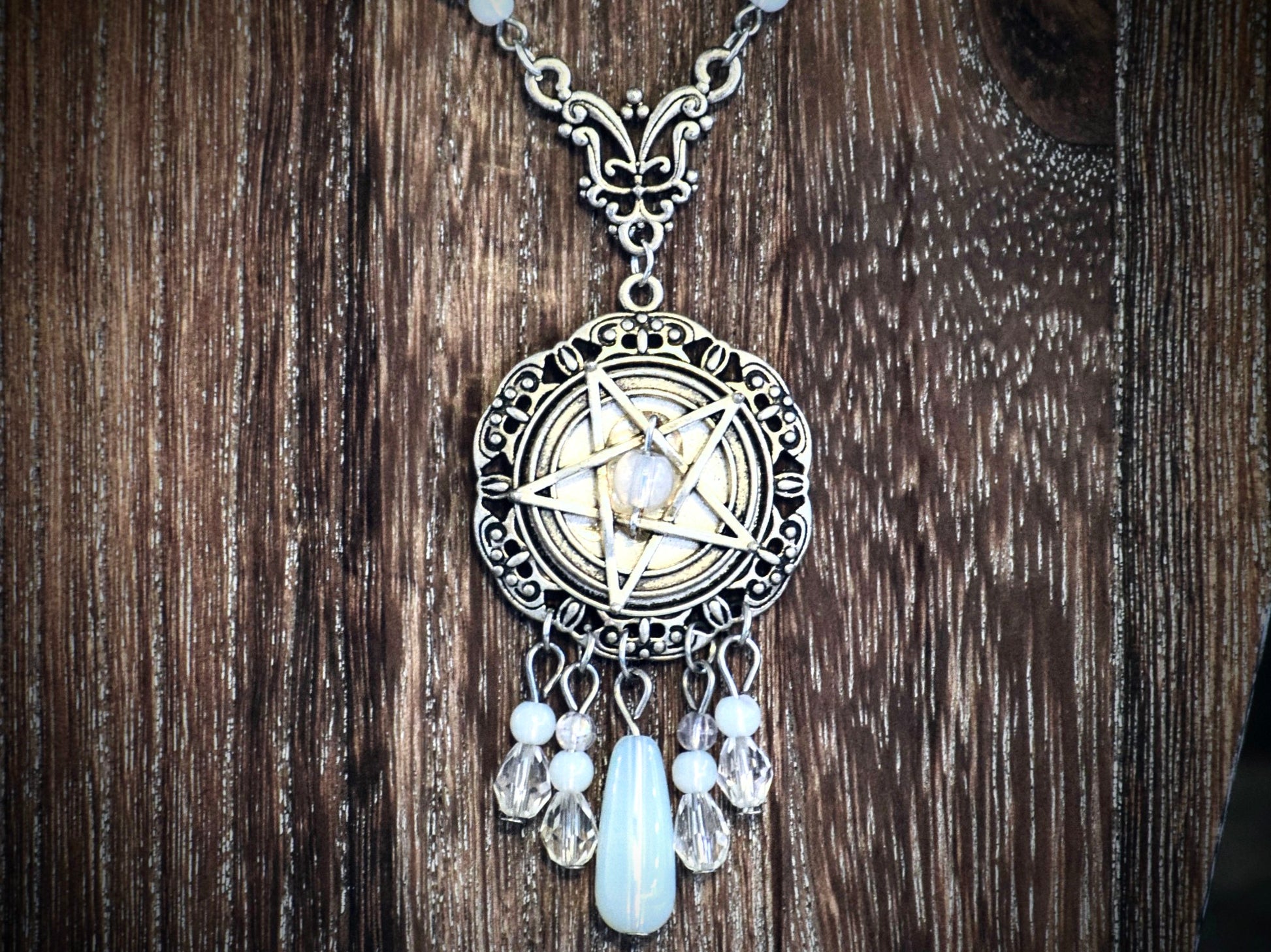We love this beautiful Pentagram necklace. It features delicate, lacy designs in the metal. The pentagram itself is tucked into a pretty coin-like shape, with Opalite beads hanging off of it. There is also an Opalite bead in the middle of the pentagram. Opalite is known for balancing ying/yang energy and enhancing creativity.