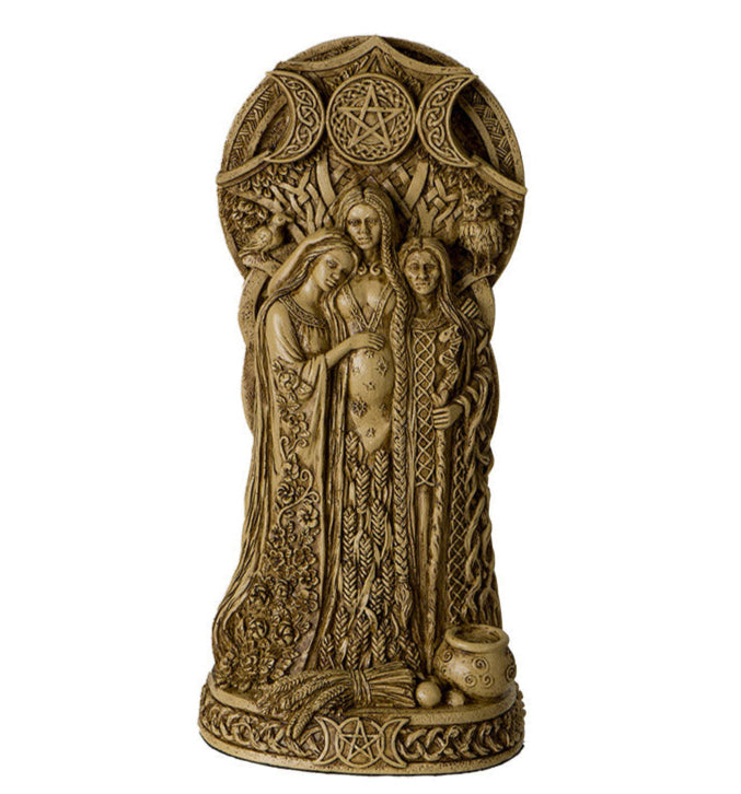 A beautiful self-standing plaque of the Triple Goddess (Mother, Maiden, & Crone). Made of cold cast resin. True color is off-white/ivory.