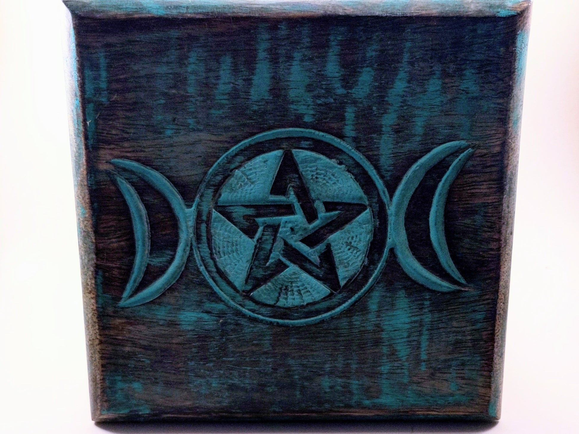 This small, green, antiqued Triple Moon altar table is perfect for smaller spaces. It is made of wood and features a large, carved Triple Moon design (with Pentagram) on the top. The four legs of the table show off beautiful craftsmanship, as well. This table can easily hold a small candle, some crystals, and even a Tarot card or two.