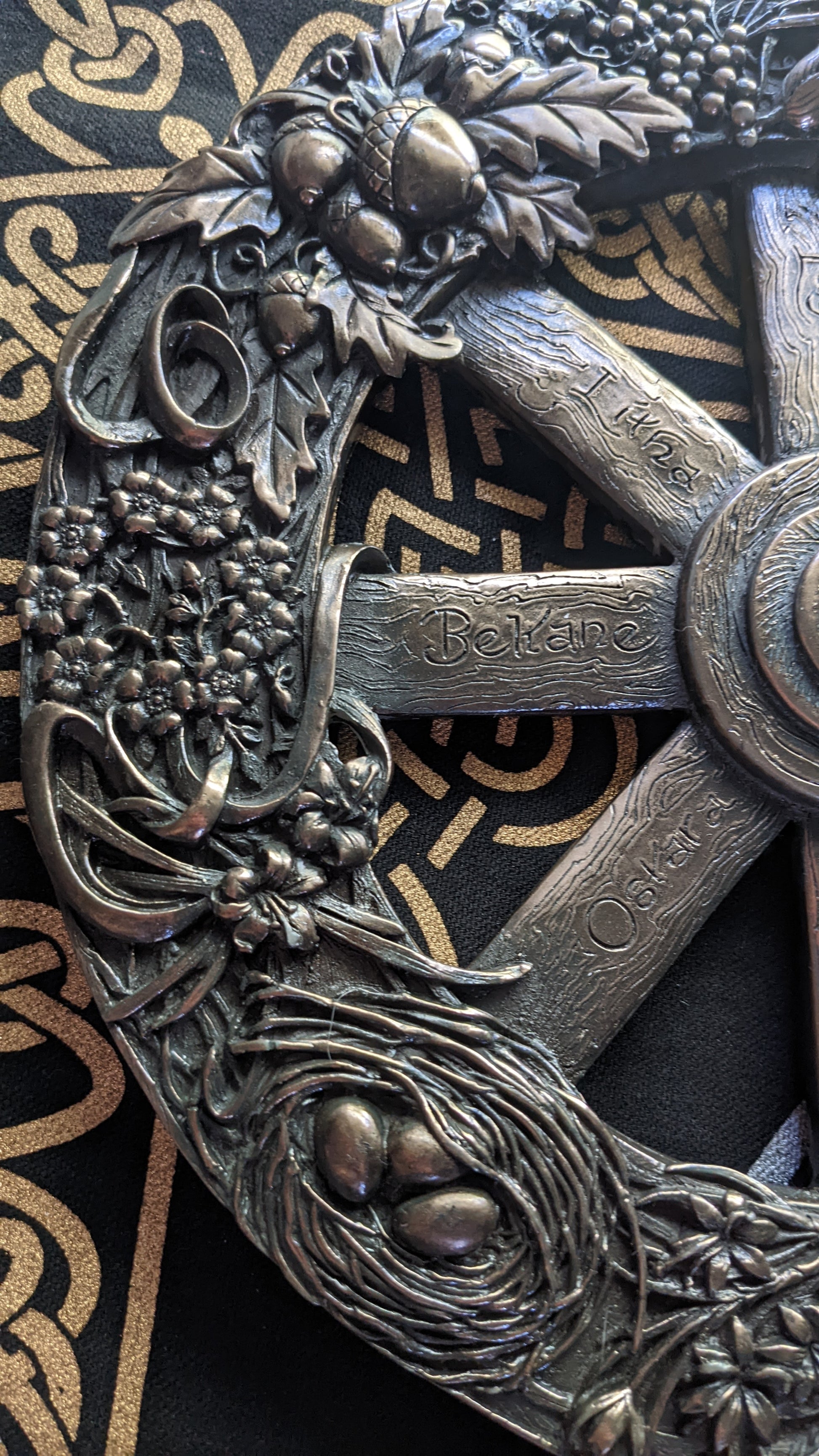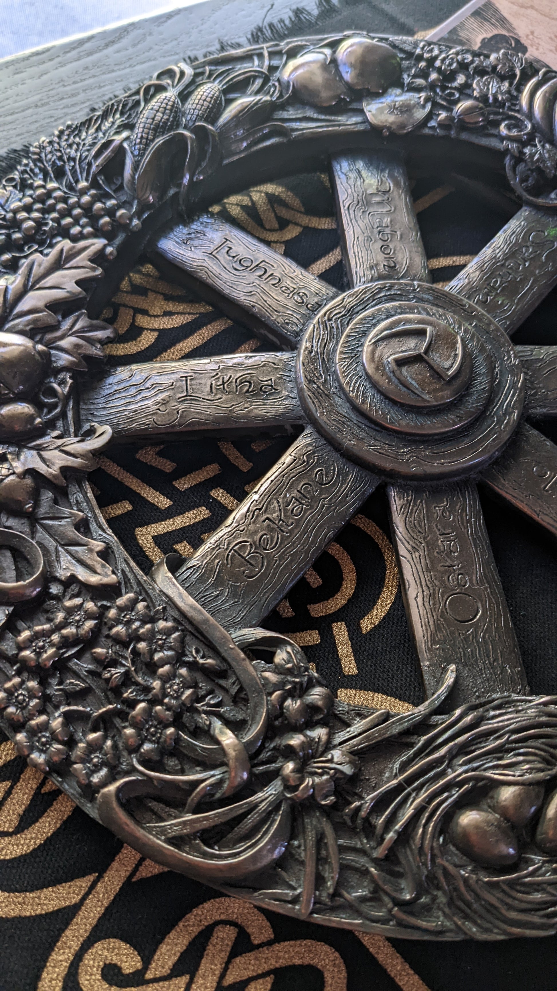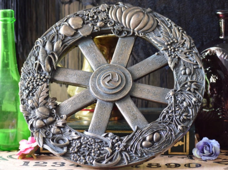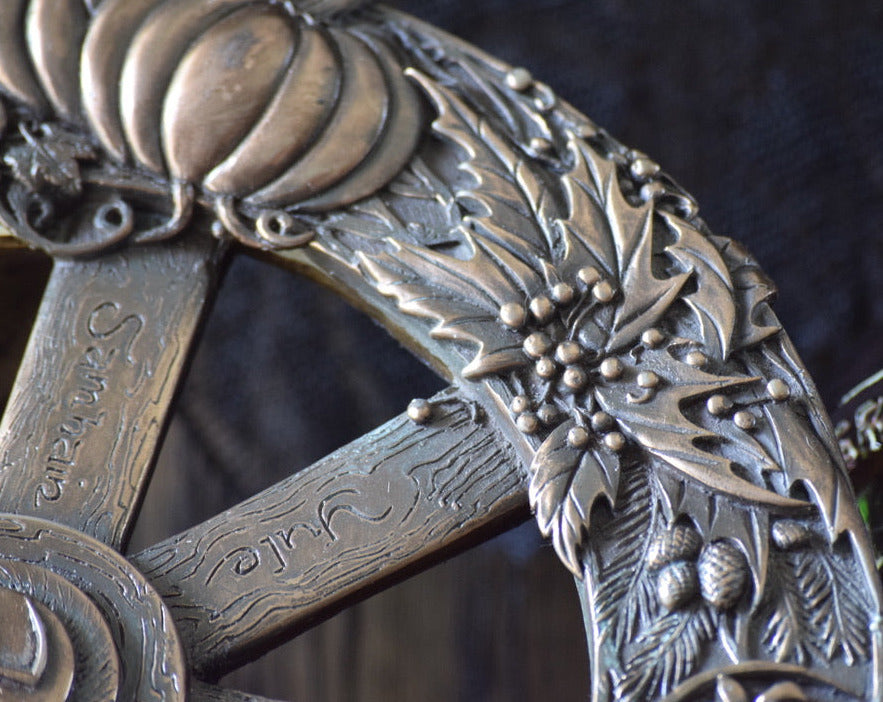 A stunning, cold-cast bronze resin wall plaque featuring the Wheel of the Year. Multiple hooks on the back allow you to rotate the wheel throughout the year to correspond with the sabbats. What we love so much about this plaque are the little representations of each sabbat tucked within the wheel. It's truly beautiful.